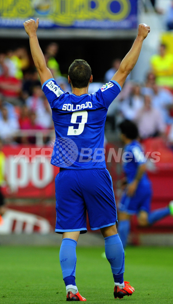 エベル・バネガ(Ever Banega、写真外)のゴールを喜ぶバレンシアのロベルト・ソルダド(Roberto Soldado、2013年6月1日撮影)。(c)AFP/CRISTINA QUICLER