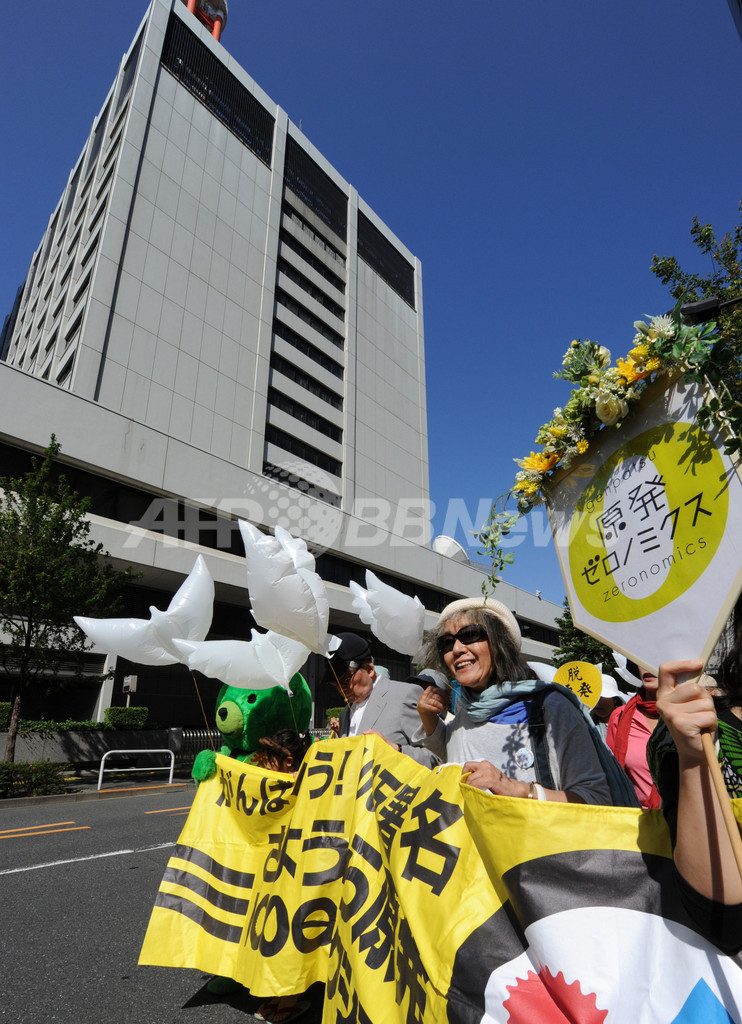 【6月3日 AFP】都内で2日、脱原発を求める大規模な集会とデモ行進が行われた。芝公園で行われた集会には主催者発表で東日本大震災による原発事故の被災者やノーベル賞作家の大江健三郎(Kenzaburo Oe)さんら7500人が参加。その後、参加者らは東京電力(TEPCO)本社前などを通るデモ行進を行った。(c)AFP