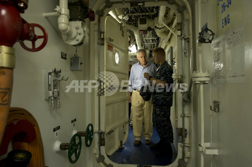 写真は、沿海域戦闘艦「フリーダム」の艦内を視察するヘーゲル米国防長官(左、2013年6月2日撮影)。(c)AFP/US Department of Defense/Erin A. Kirk-Cuomo