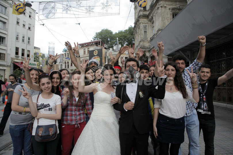 【6月3日 AFP】大規模な反政府デモが機動隊と衝突し多数の負傷者を出したトルコ・イスタンブール(Istanbul)のタクシム広場(Taksim Square)近くで2日、1組のカップルが路上結婚式を挙げ、デモ参加者らから祝福を受けた。