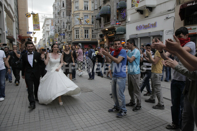 【6月3日 AFP】大規模な反政府デモが機動隊と衝突し多数の負傷者を出したトルコ・イスタンブール(Istanbul)のタクシム広場(Taksim Square)近くで2日、1組のカップルが路上結婚式を挙げ、デモ参加者らから祝福を受けた。