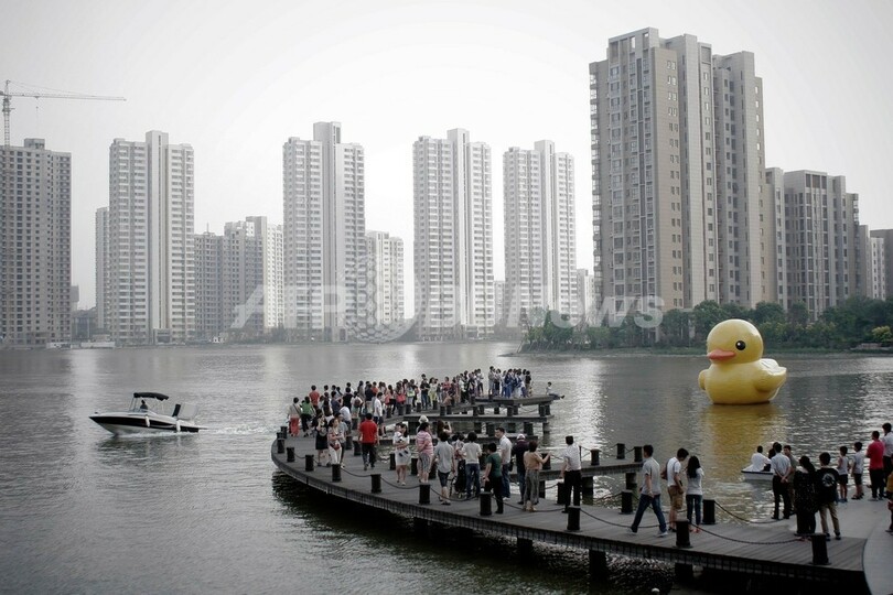 【6月3日 AFP】(写真追加)香港(Hong Kong)のビクトリア・ハーバー(Victoria Harbour)で人気を集めているゴム製の巨大アヒルのアート作品をまねた「偽アヒル」が、中国本土に出現した。中国メディアが1日に伝えた。