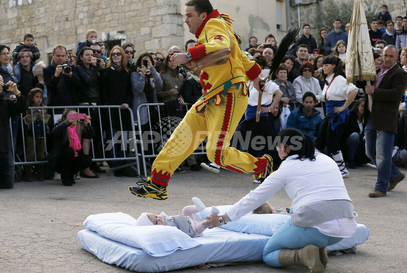 【6月3日 AFP】スペインのカストリージョ・デ・ムルシア(Castrillo de Murcia)で2日、悪魔に扮(ふん)した男たちが路上に寝かせた赤ちゃんの上を飛び越える厄払いの伝統行事「エル・コラチョ(El Colacho)」が行われた。