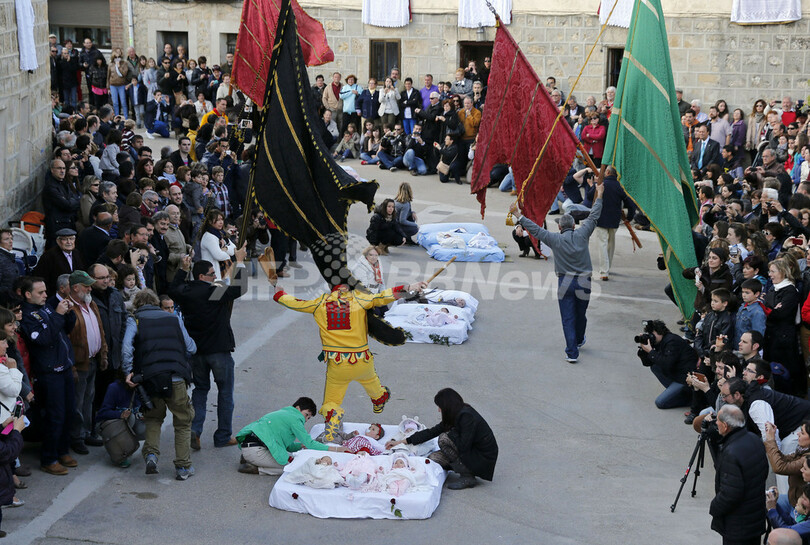 【6月3日 AFP】スペインのカストリージョ・デ・ムルシア(Castrillo de Murcia)で2日、悪魔に扮(ふん)した男たちが路上に寝かせた赤ちゃんの上を飛び越える厄払いの伝統行事「エル・コラチョ(El Colacho)」が行われた。