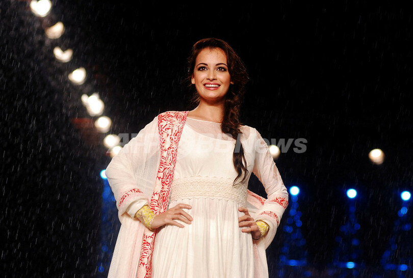 ショーのランウェイには、ボリウッドスターの女優のアミーシャ・パテル(Ameesha Patel)やディア・ミルザ(Dia Mirza)、ネハ・ドゥピア(Neha Dhupia)らが登場し、地元デザイナーのマニッシュ・マルホトラ(Manish Malhotra)らによる作品を披露した。(c)AFP