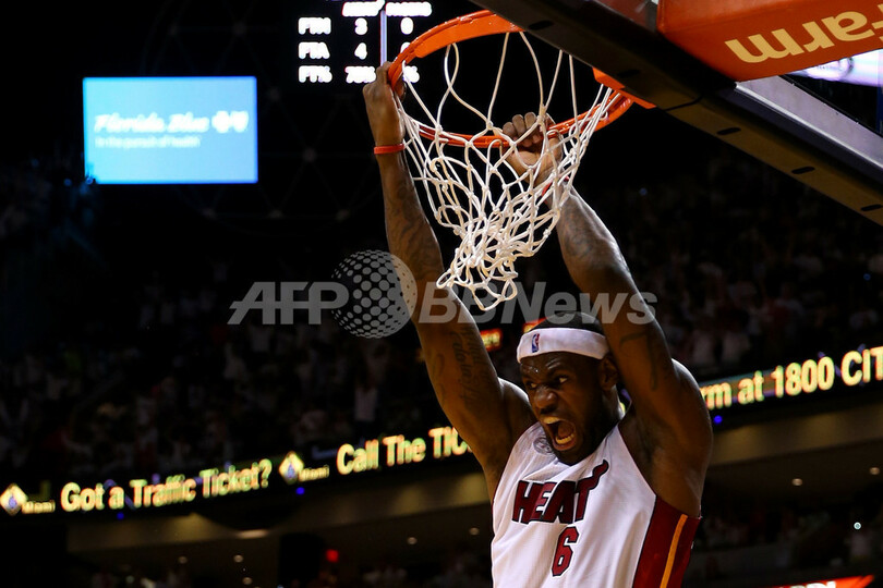 ダンクシュートを決めるマイアミ・ヒートのレブロン・ジェームズ(LeBron James、2013年6月3日撮影)。(c)AFP/Getty Images/Mike Ehrmann