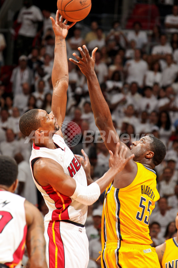ペイサーズはロイ・ヒバート(Roy Hibbert)が18得点を記録し、チームをけん引したものの、2000年以来となるファイナル進出にあと一歩届かなかった。(c)AFP