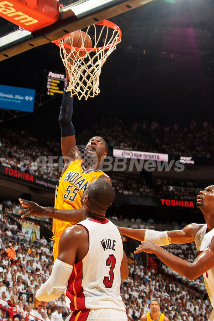 ペイサーズはロイ・ヒバート(Roy Hibbert)が18得点を記録し、チームをけん引したものの、2000年以来となるファイナル進出にあと一歩届かなかった。(c)AFP