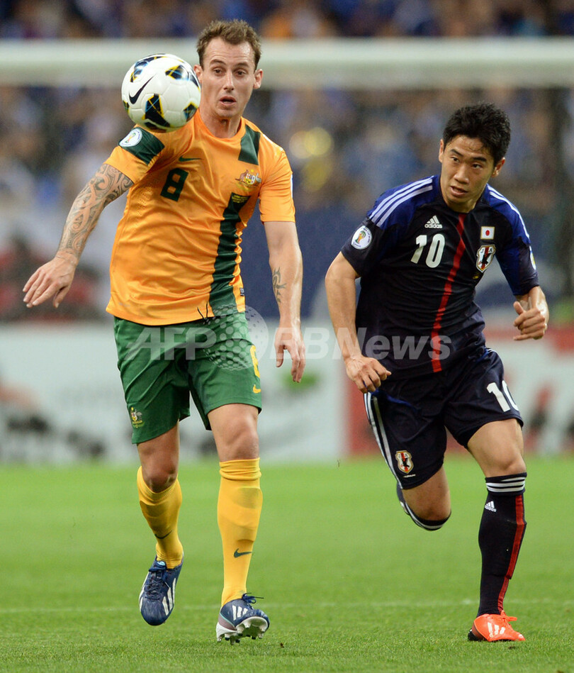 オーストラリアのルーク・ウィルクシャー(Luke Wilkshire、左)とボールを競る香川真司(Shinji Kagawa、2013年6月4日撮影)。(c)AFP/TOSHIFUMI KITAMURA