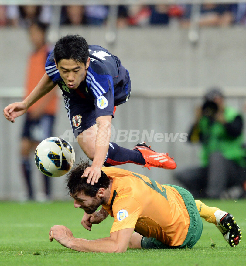 オーストラリアのササ・オグネノブスキ(Sasa Ognenovski)のスライディングタックルを受ける香川真司(Shinji Kagawa、2013年6月4日撮影)。(c)AFP/TOSHIFUMI KITAMURA