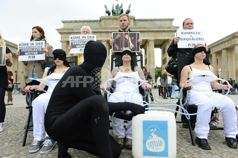 【6月5日 AFP】ドイツ・ベルリン(Berlin)のブランデンブルク門(Brandenburg Gate)の前で4日、国際動物愛護団体「動物の倫理的扱いを求める人々の会(People for the Ethical Treatment of Animals、PETA)」の活動家らが、自らを鎖で椅子につなぎ、胸に搾乳機を付けて、酪農業界での乳牛の扱いに対する抗議活動を行った。