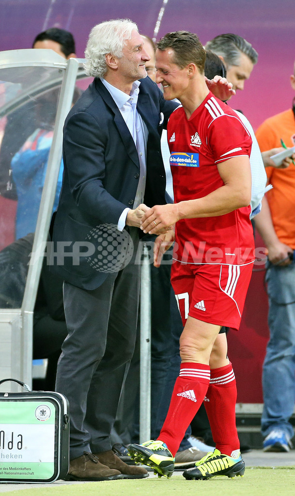 試合に出場した元F1ドライバーのミハエル・シューマッハ(Michael Schumacher)氏(右)を迎える元ドイツ代表監督のルディ・フェラー(Rudi Voller)氏(2013年6月5日撮影)。(c)AFP/JAN WOITAS