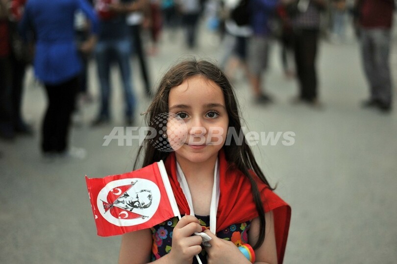 写真はタクシム広場で、初代大統領ムスタファ・ケマル・アタチュルク(Mustafa Kemal Ataturk)を描いた旗を手にする少女(2013年6月5日撮影)。(c)AFP/OZAN KOSE