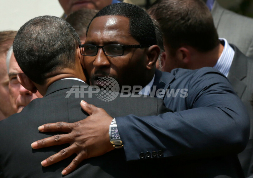 バラク・オバマ大統領(手前左)と抱擁を交わすボルティモア・レイヴンズのレイ・ルイス(Ray Lewis、2013年6月5日撮影)。(c)AFP/Getty Images/Win McNamee