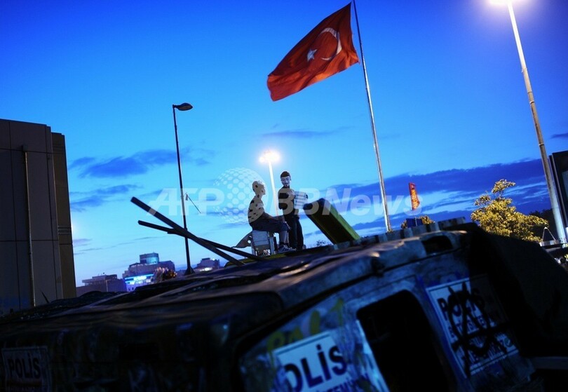 写真はイスタンブールタクシム広場(Taksim Square)で行われている抗議行動中、「抵抗と匿名性の象徴」とされる「ガイ・フォークス(Guy Fawkes)」の仮面をつけてバスの上に立つ少年たち(2013年6月7日撮影)。(c)AFP/BULENT KILIC