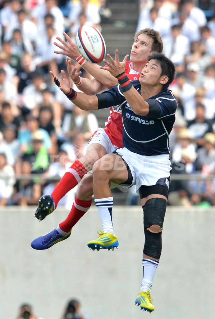 ボールを競るウェールズのリーアム・ウィリアムズ(Liam Williams、奥)と日本の藤田慶和(Yoshikazu Fujita、2013年6月8日撮影)。(c)AFP/KAZUHIRO NOGI