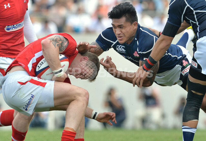 ウェールズのオーウェン・ウィリアムズ(Owen Williams、左)にタックルを仕掛ける日本のマレ・サウ(Male Sau、2013年6月8日撮影)。(c)AFP/KAZUHIRO NOGI