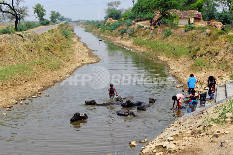 【6月12日 AFP】世界環境デー(World Environment Day)の前日にあたる4日、インド東部ジャルカンド(Jharkhand)州の州都ランチー(Ranchi)郊外で、水を入れる容器を頭に乗せ、干上がった池を歩く少年の姿が見られた。