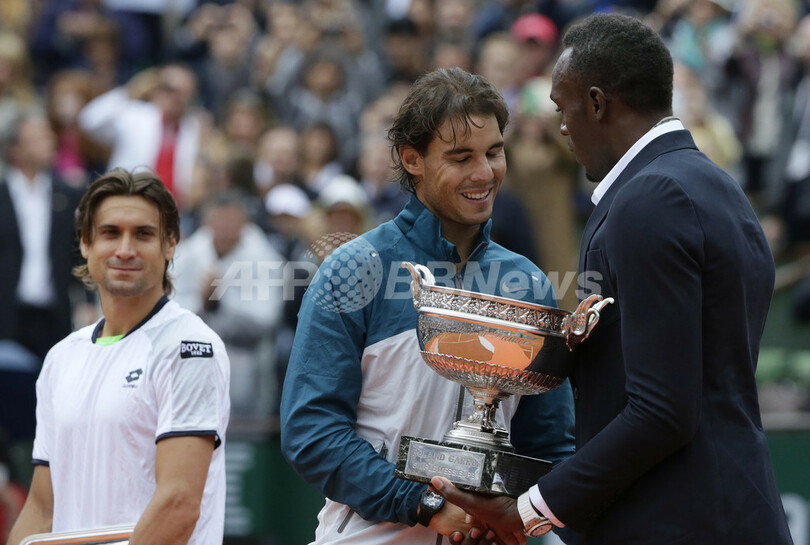 陸上選手のウサイン・ボルト(Usain Bolt、右)から優勝トロフィーを授与されるラファエル・ナダル(中央、2013年6月9日撮影)。(c)AFP/KENZO TRIBOUILLARD