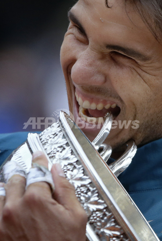 優勝トロフィーをかむラファエル・ナダル(2013年6月9日撮影)。(c)AFP/KENZO TRIBOUILLARD
