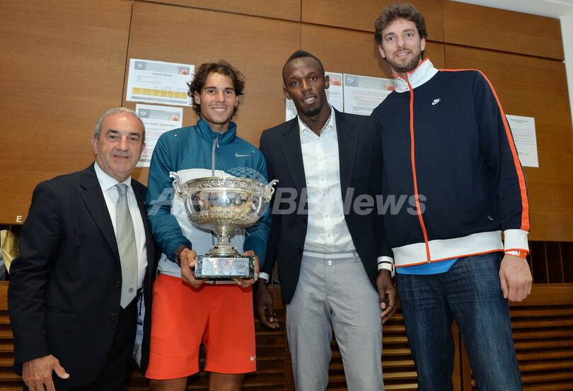 記念撮影に臨む(左から)フランステニス協会のジャン・ガカッシン(Jean Gachassin)会長、ラファエル・ナダル、陸上選手のウサイン・ボルト(Usain Bolt)、スペイン人NBA選手のパウ・ガソル(Pau Gasol、2013年6月9日撮影)。(c)AFP/FFT/CHRISTOPHE SAIDI