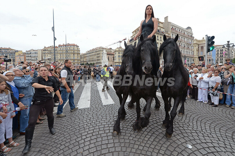 仏マルセイユ(Marseille)で9日、先月17日から続いていた『TransHumance(移牧の意)』イベントがグランドフィナーレを迎えた。このイベントは、マルセイユが2013年の「欧州文化首都(European Capital of Culture)」に指定されたことを受け、開催された関連行事の一つ。Theatre du Centaureの主催で数千頭の動物たちがマルセイユの街を練り歩いた。写真は移牧を先導するTheatre du Centaureのカミーユ(Camille)さん(2013年6月9日撮影)。(c)AFP/BORIS HORVAT