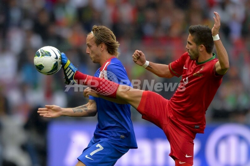 ボールを競るクロアチアのイヴァン・ラキティッチ(Ivan Rakitic)とポルトガルのジョアン・モウティーニョ(Joao Moutinho、2013年3月6日撮影)。(c)AFP/FABRICE COFFRINI