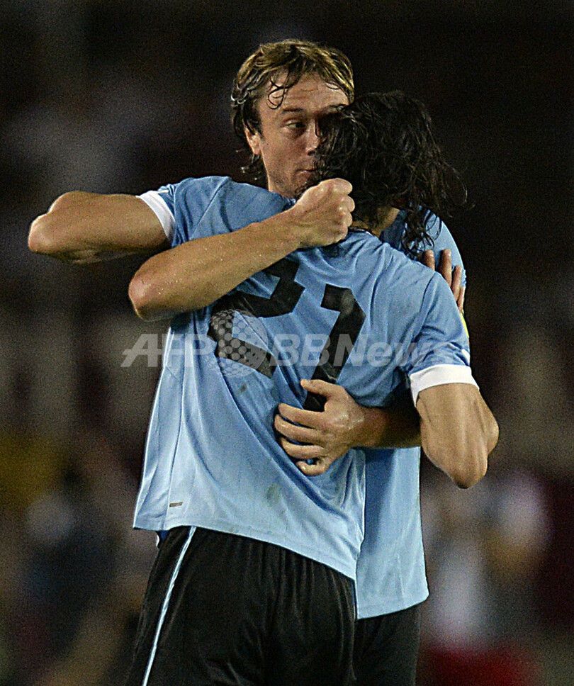 前半28分に得点を決めたエディンソン・カヴァーニ(Edinson Cavani、手前)を祝福するウルグアイのディエゴ・ルガーノ(Diego Lugano、2013年6月11日撮影)。(c)AFP/Juan BARRETO
