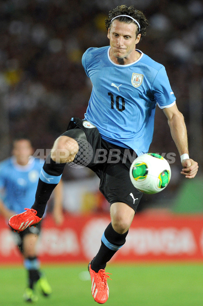 ボールをコントロールするウルグアイのディエゴ・フォルラン(Diego Forlan、2013年6月11日撮影)。(c)AFP/LEO RAMIREZ