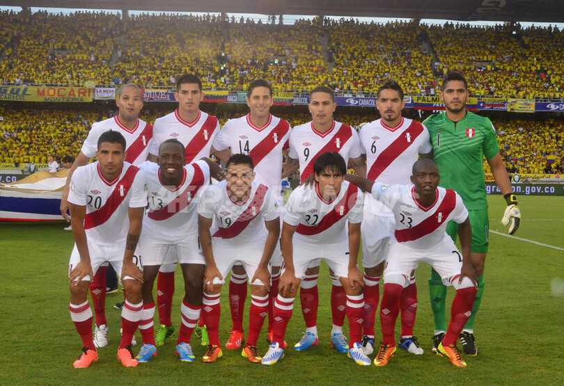 試合開始前の写真撮影に臨むペルーの選手(2013年6月11日撮影)。(c)AFP/Luis Acosta