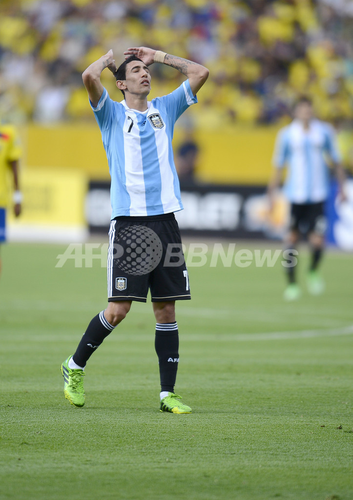 試合中、頭を抱えるアルゼンチンのアンヘル・ファビアン・ディ・マリア(Angel Fabian Di Maria、2013年6月11日撮影)。(c)AFP/Rodrigo Buendia