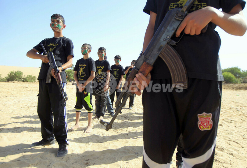 写真はキャンプで軍事訓練を受けるパレスチナ人の少年たち(2013年6月12日撮影)。(c)AFP/SAID KHATIB