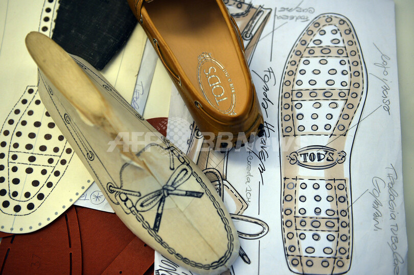 日の光が差し込む工場には、ブランドの成功の秘訣ともいえる数々の特注木製靴型が吊るされている。「トッズ」は俳優のハリソン・フォード(Harrison Ford)やブラッド・ピット(Brad Pitt)、モナコ公国のカロリーヌ公女(Princess Caroline)らセレブリティをはじめ、ブラジルや中国などの新興国の多くの富裕層に愛され、不況の中でも売上を劇的に伸ばしている。(c)AFP