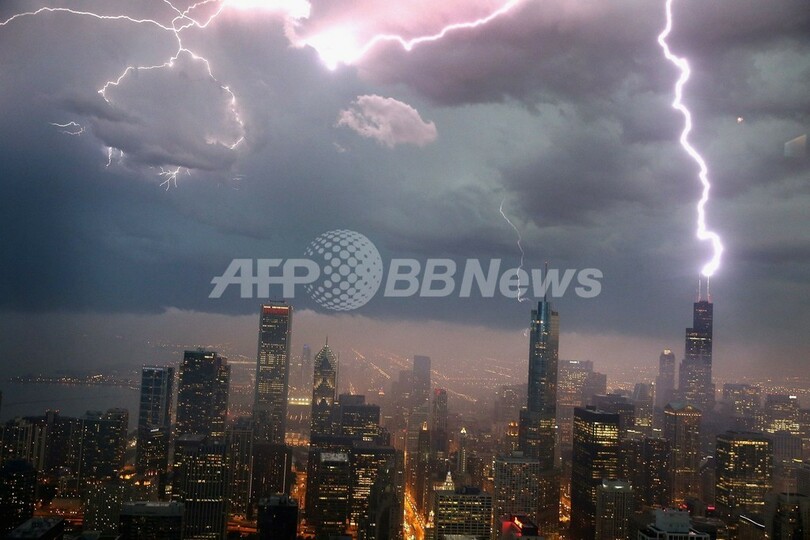 【6月13日 AFP】米イリノイ(Illinois)州シカゴ(Chicago)で12日、中心部の高層ビル「ウィリスタワー(Willis Tower)」に雷が落ちた瞬間をカメラがとらえた。