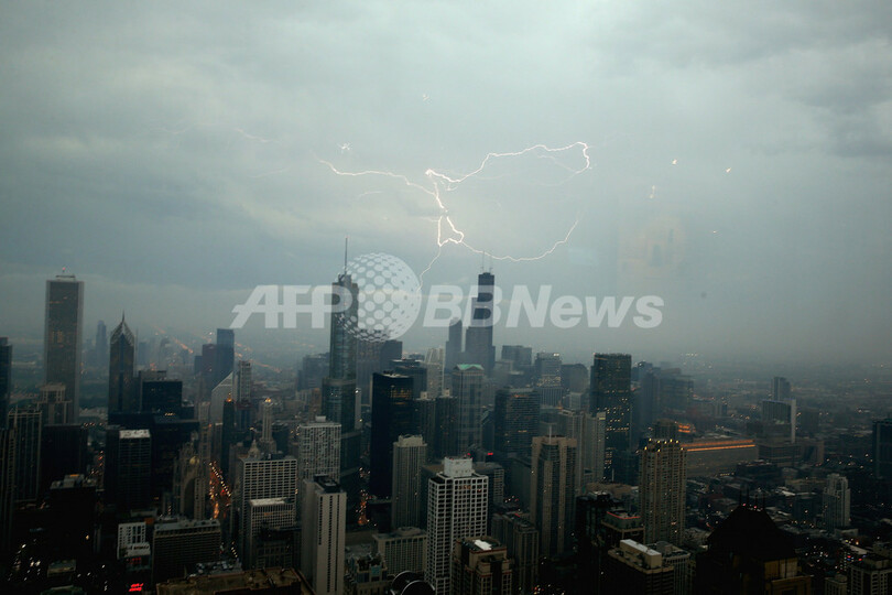 【6月13日 AFP】米イリノイ(Illinois)州シカゴ(Chicago)で12日、中心部の高層ビル「ウィリスタワー(Willis Tower)」に雷が落ちた瞬間をカメラがとらえた。