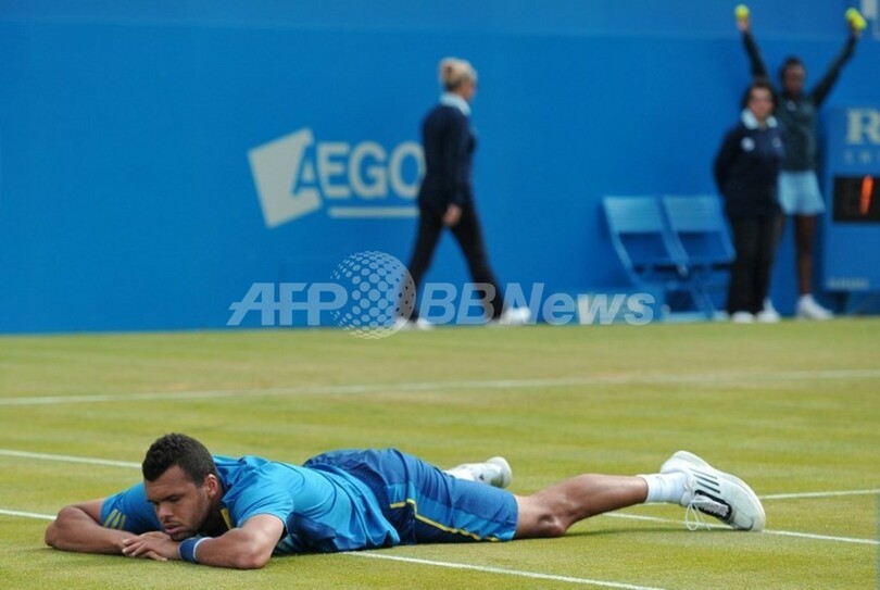 試合中、コートにうつぶせになるジョーウィルフリード・ツォンガ(2013年6月13日撮影)。(c)AFP/CARL COURT