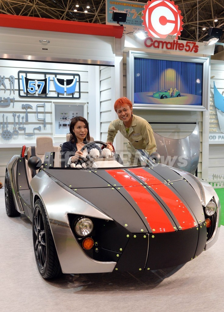 写真はトヨタ自動車(Toyota Motor)が出展した、親子で楽しむ3人乗り電気自動車「Camatte57s(カマッテ・ゴジュウナナ・エス)」と、デザイナーの根津孝太(Kota Nezu)氏(右)。全長3メートル、全幅1.44メートルの車体の外板が57枚の「着せ替えパネル」でできており、色やデザインを替えて楽しめる。普通車のほかスポーツ車タイプの「Camatte57sスポーツ」の2種類のパネルが用意されている(2013年6月13日撮影)。(c)AFP/Yoshikazu TSUNO