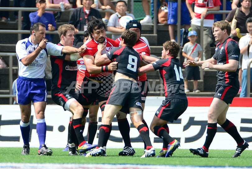 言い争うウェールズのロイド・ウィリアムズ(Lloyd Williams、中央右)と日本の大野均(Hitoshi Ono、中央左、2013年6月15日撮影)。(c)AFP/Toru YAMANAKA