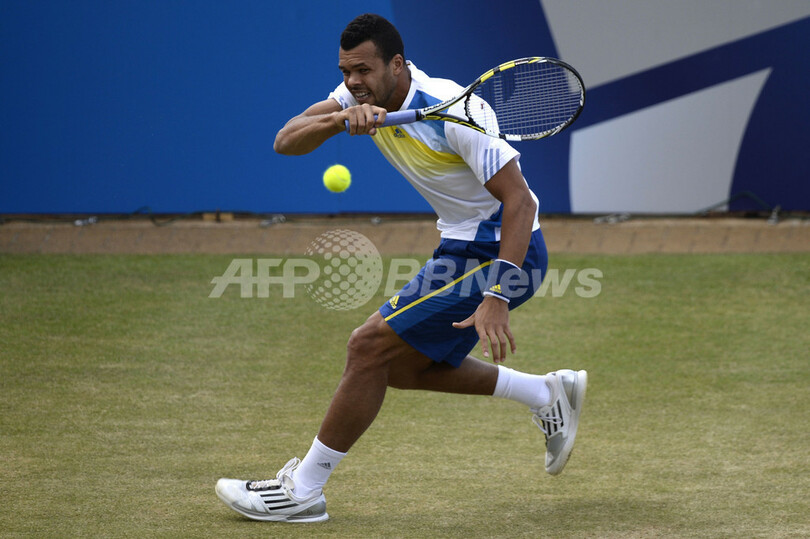 リターンを打つジョーウィルフリード・ツォンガ(2013年6月15日撮影)。(c)AFP/ADRIAN DENNIS
