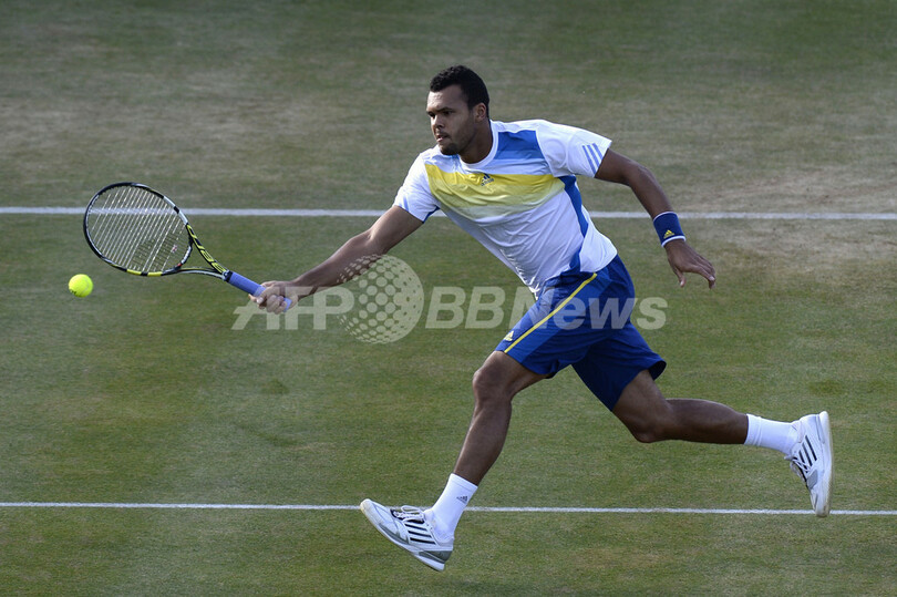 リターンを打つジョーウィルフリード・ツォンガ(2013年6月15日撮影)。(c)AFP/ADRIAN DENNIS