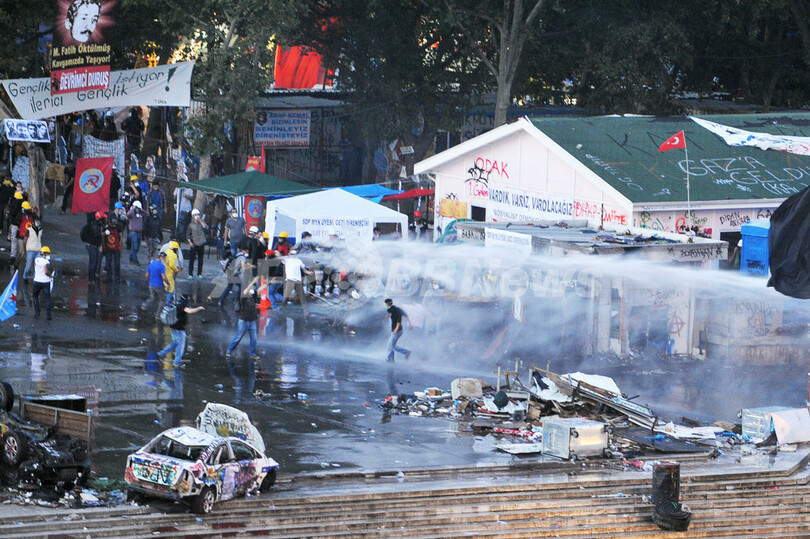 全国に広がる反政府デモの中心地・ゲジ公園(Gezi Park)から退去しなければ機動隊を介入させると同首相がデモ隊に警告してから2時間後、機動隊が同公園内に入って催涙弾と放水銃を使用した。