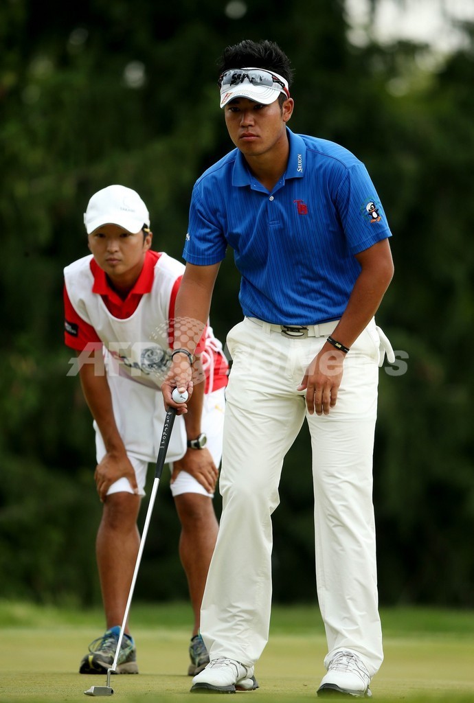 1番ホールでパットのラインを読む松山英樹(Hideki Matsuyama、2013年6月16日撮影)。(c)AFP/Getty Images/Andrew Redington