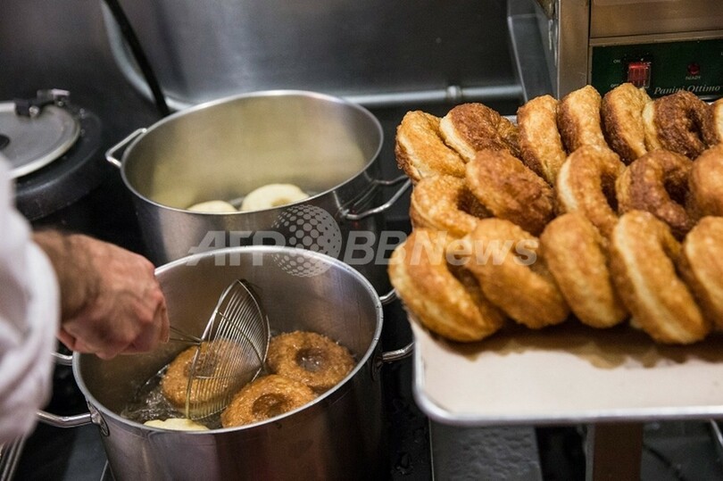 すかさず1人の客が、自分が並んでいた順番を「100ドル」(約9500円)で他の客に譲ろうとすると、友人同士の2人組が喜んで応じた。2人はそれぞれクロナッツ2個ずつを嬉しそうに手にした。(c)AFP/Brigitte Dusseau