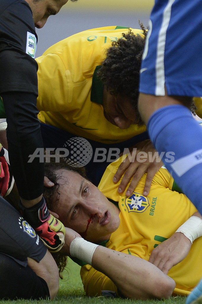 試合中に鼻を負傷したブラジルのダビド・ルイス(David Luiz、2013年6月19日撮影)。(c)AFP/JUAN BARRETO