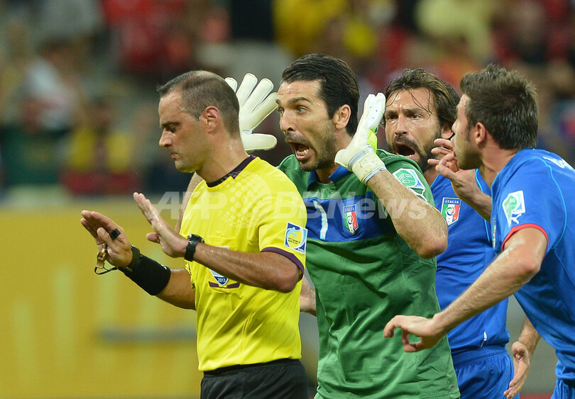 PKの判定に抗議するイタリアのジャンルイジ・ブッフォン(Gianluigi Buffon、2013年6月19日撮影)。(c)AFP/VINCENZO PINTO