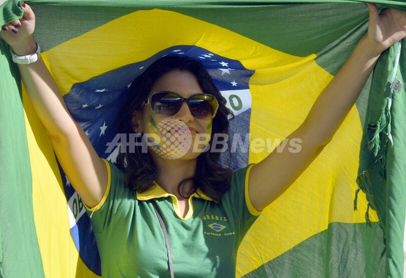 グループA、ブラジル対メキシコ。試合開始を待つブラジルのサポーター(2013年6月19日撮影)。(c)AFP/YURI CORTEZ