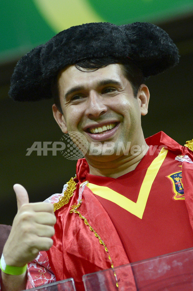 グループB、スペイン対ウルグアイ。ポーズをとるスペインのサポーター(2013年6月16日撮影)。(c)AFP/LLUIS GENE