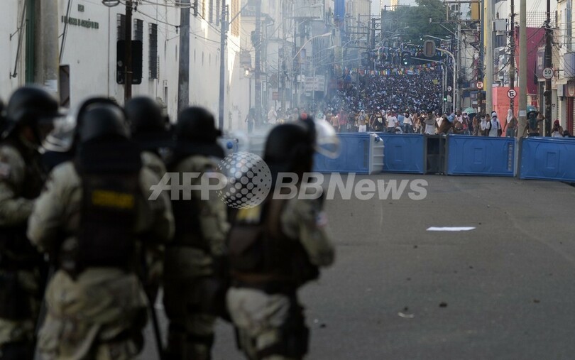写真はバイア(Bahia)州サルバドール(Salvador)で、サッカー・コンフェデレーションズカップの会場となっている競技場アレナ・フォンテ・ノバ(Arena Fonte Nova)への道を封鎖するデモ隊に対峙(たいじ)する機動隊(2013年6月20日撮影)。(c)AFP/JUAN BARRETO