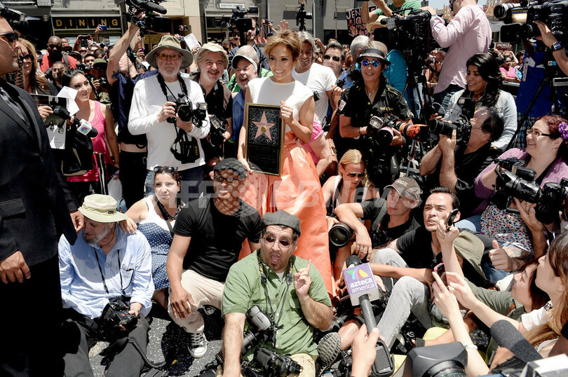 写真は、カメラマンたちと一緒に写真に写るロペス(2013年6月20日撮影)。(c)AFP/Getty Images/Kevin Winter