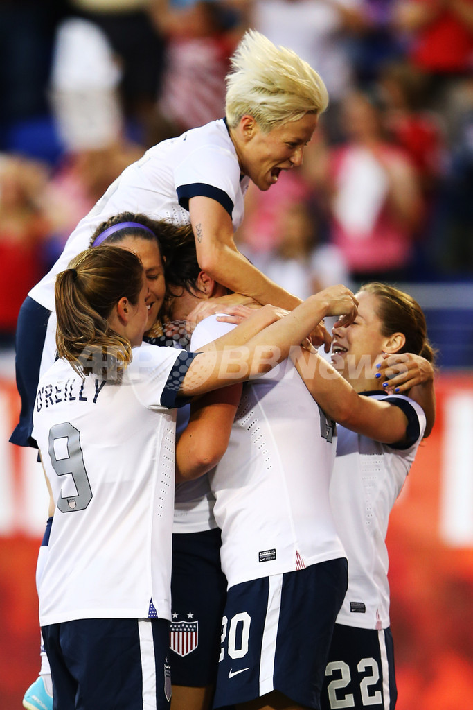 タイ記録となる通算158得点目を決めチームメイトに祝福されるアビー・ワンバック(中央、2013年6月20日撮影)。(c)AFP/Getty Images/Al Bello